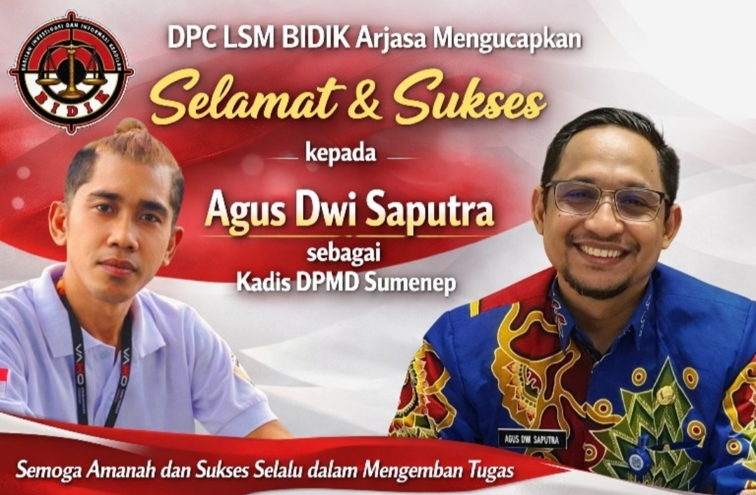 Sumenep, pilarjatim.id — Ketua DPC LSM BIDIK Kecamatan Arjasa, Muhlis Fajar, menyampaikan ucapan selamat dan sukses kepada Agus Dwi Saputra atas pelantikannya sebagai Kepala Dinas Pemberdayaan Masyarakat dan Desa (DPMD) Kabupaten Sumenep.